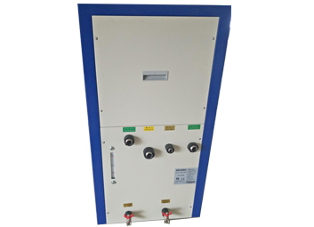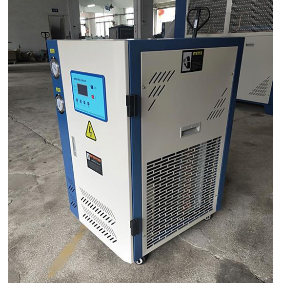 冷水机制冷剂轮回系统时蒸发器中的液态制冷剂吸收水中的热量并开始蒸发,制冷剂与水之间形成一定的温度差,液态制冷剂亦完全蒸发变为气态后被压缩机吸入并压缩,气态制冷剂通过冷凝器释放热量,凝聚成液体,通过热力膨胀阀节流后变成低温低压制冷剂进入蒸发器,完成制冷剂轮回过程。占地面积小,型号多,满足不同的设备散热需要,转向轮移动方便。